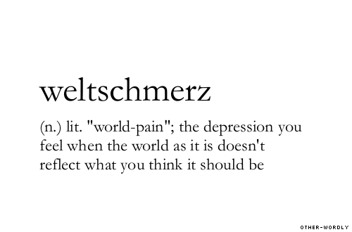 Today we talked about the concept of Weltschmerz, the pain of being aware of the suffering of the world. As you explained it, ‘Welt’ meant ‘world’ and ‘Schmerz’ meant ‘pain’.